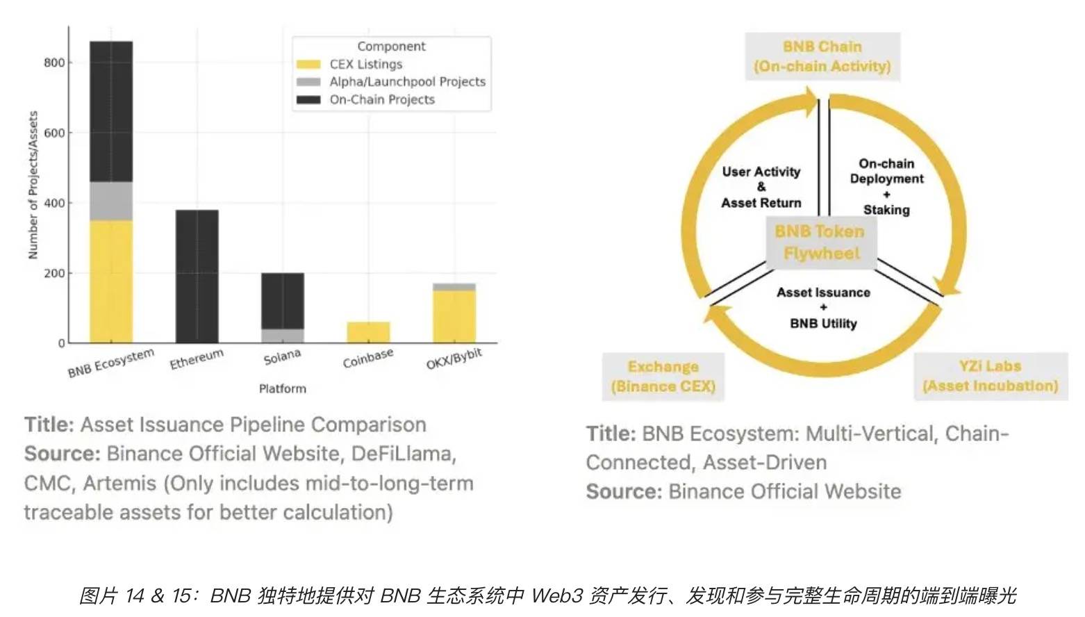BNB 生态系统通过其支持性风险投资伙伴(如 YZi Labs),为资产发行提供了一个强大、高效且全面的平台。这些风险投资伙伴处于战略位置,能够从最初的概念验证阶段开始引入投资项目,引导这些项目完成融资和初始分发,并随后通过 BNB Chain 促进这些项目的全球交易和去中心化生态系统增长。通过确保建立表现顶级的交易对 (通过 CEX),BNB 正在成为一个强大且或许是 Web3 领域最有效的全周期资产发行中心之一。