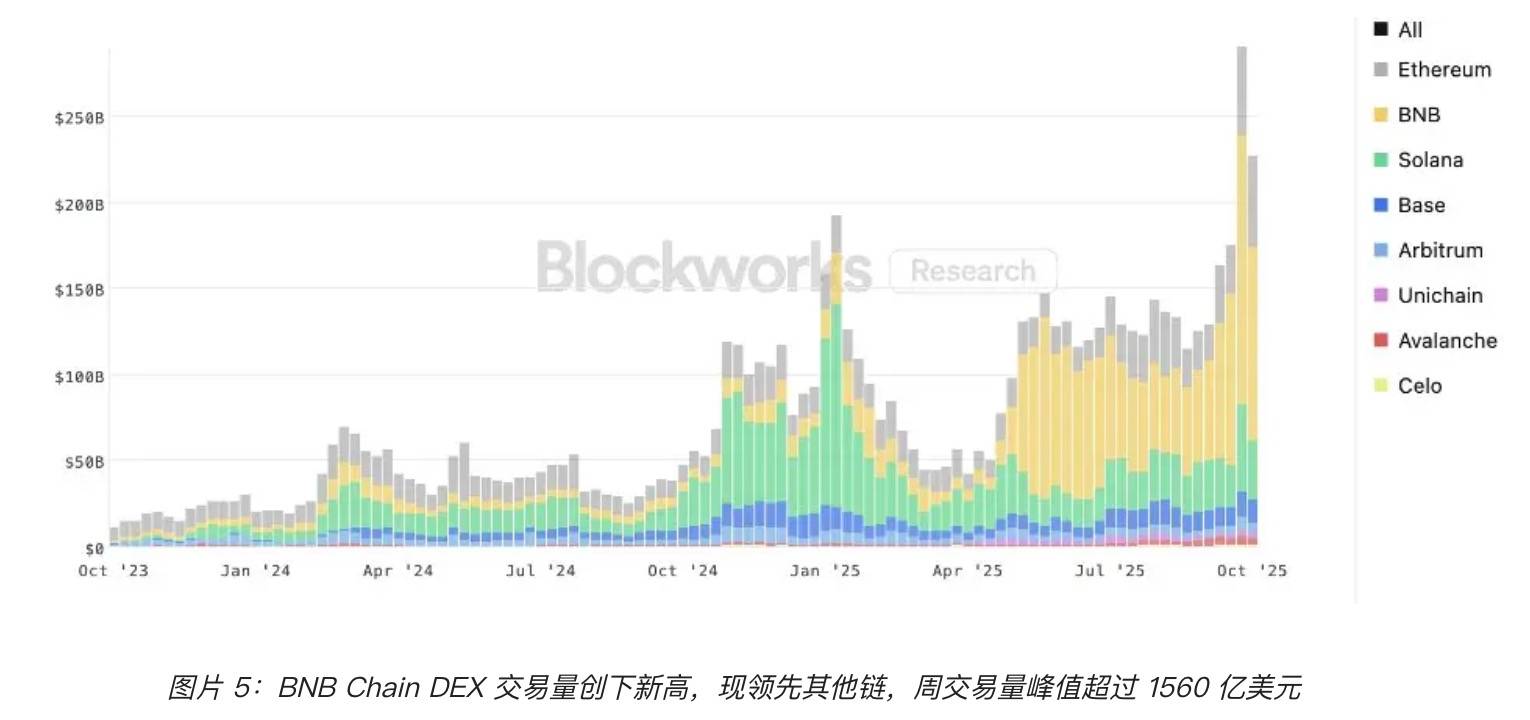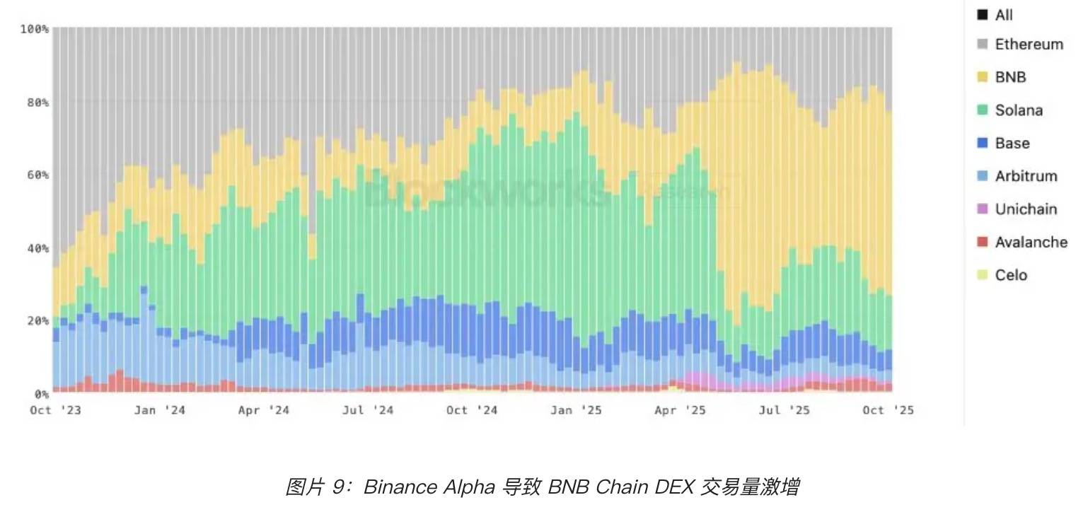 一个很有前景的例子是,在 2025 年年中,币安推出了 Binance Alpha,一个流动性激励和建设者计划,引发了链上 DEX 活动的急剧增加。BNB Chain 的 DEX 交易量曾短暂超过链上现货总交易量的 70%,展示了生态系统潜在用户和开发者参与的深度。
