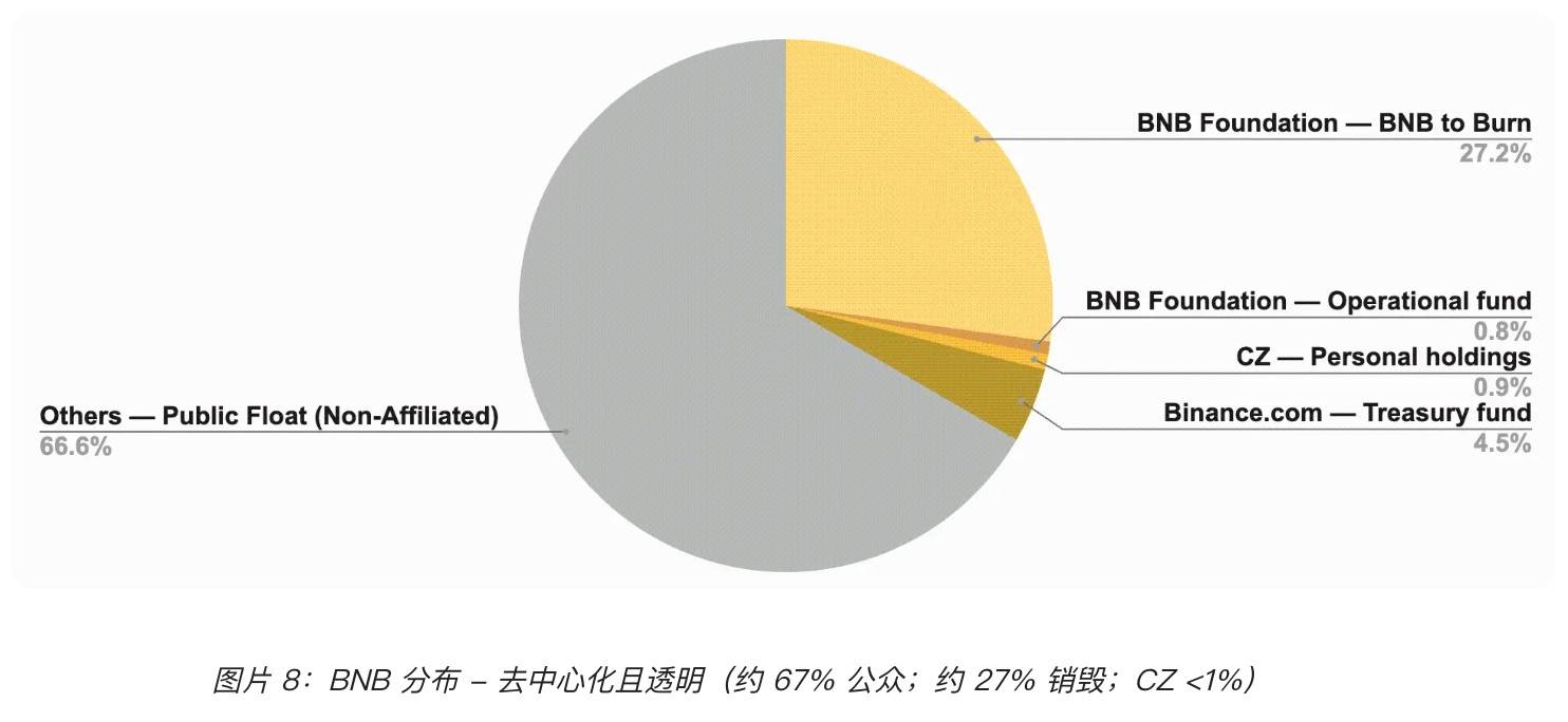 大约三分之二的供应量由非关联的公众持有者持有 (在交易所和自我托管中),而 CZ 的个人持股不到 1%。的财库持有流通中 BNB 总量的大约 4-5%。约 27% 的流通 BNB 由 BNB 基金会持有,并被圈定用于程序化销毁 (不出售)——这是一个透明的链上机制,随着时间的推移加强了 BNB 的通缩设计。此外,被标记的最大钱包是销毁/运营/托管钱包,而非控制性头寸,这表明内部人集中度低,分布更透明、去中心化和公平。