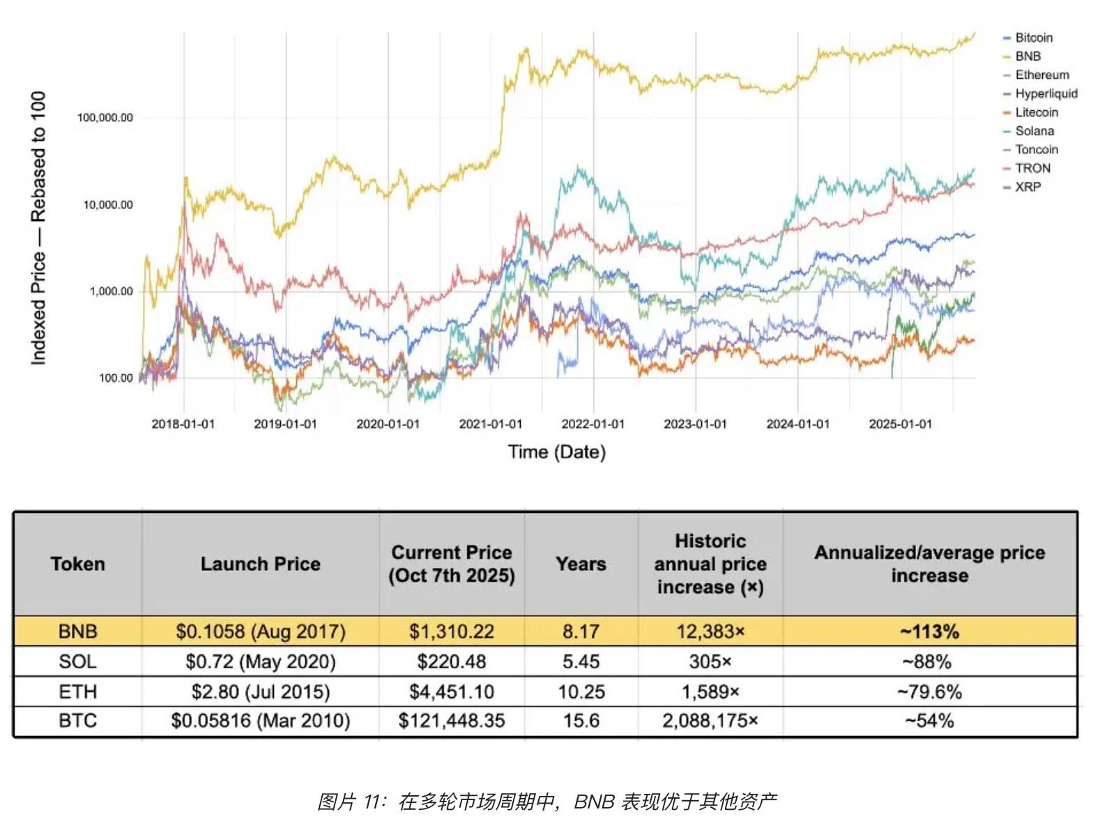 在多个市场周期中,BNB 相对于同类的 Layer-1 区块链和基准数字资产,表现出了一致的结构性优异表现。其价值的长期增长反映了功能实用性、程序化的供应纪律和生态系统规模整合的结合。