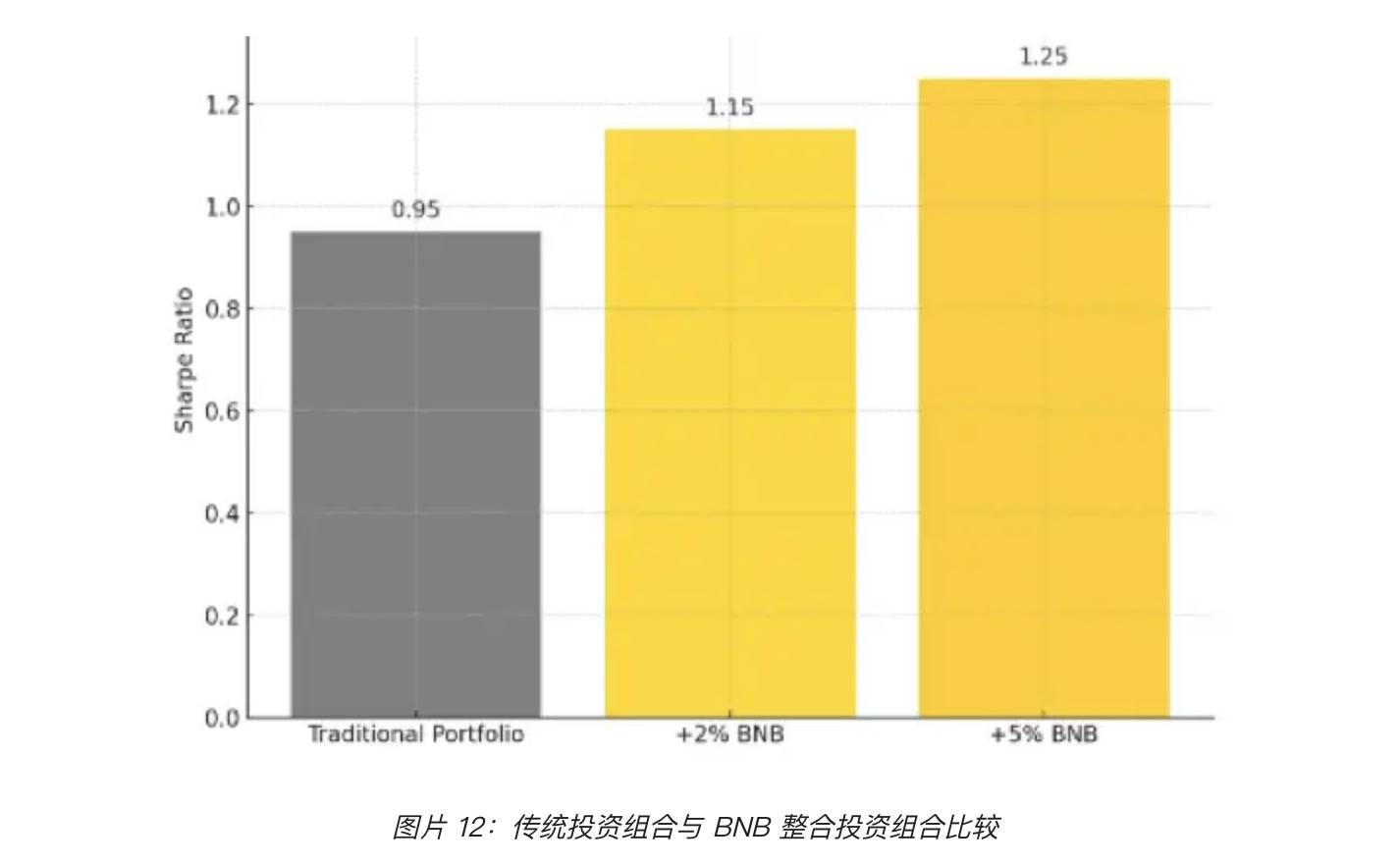 BNB 不仅为加密原生用户量身定制,其设计也易于没有加密经验的新手理解和使用。引入 BNB 可能会显著改善风险调整后的回报;例如,在模拟模型中,将 2%–5% 的 BNB 添加到标准的股票-债券-商品组合中,夏普比率从 0.95 提高到高达 1.25。这证明了 BNB 作为另类资产配置的有效性——增强了多元化,并捕获了 Web3 的参与度和潜在收益。当前市场条件可能为资产管理公司提供了一个将 BNB 整合为另类资产的结构性机会。