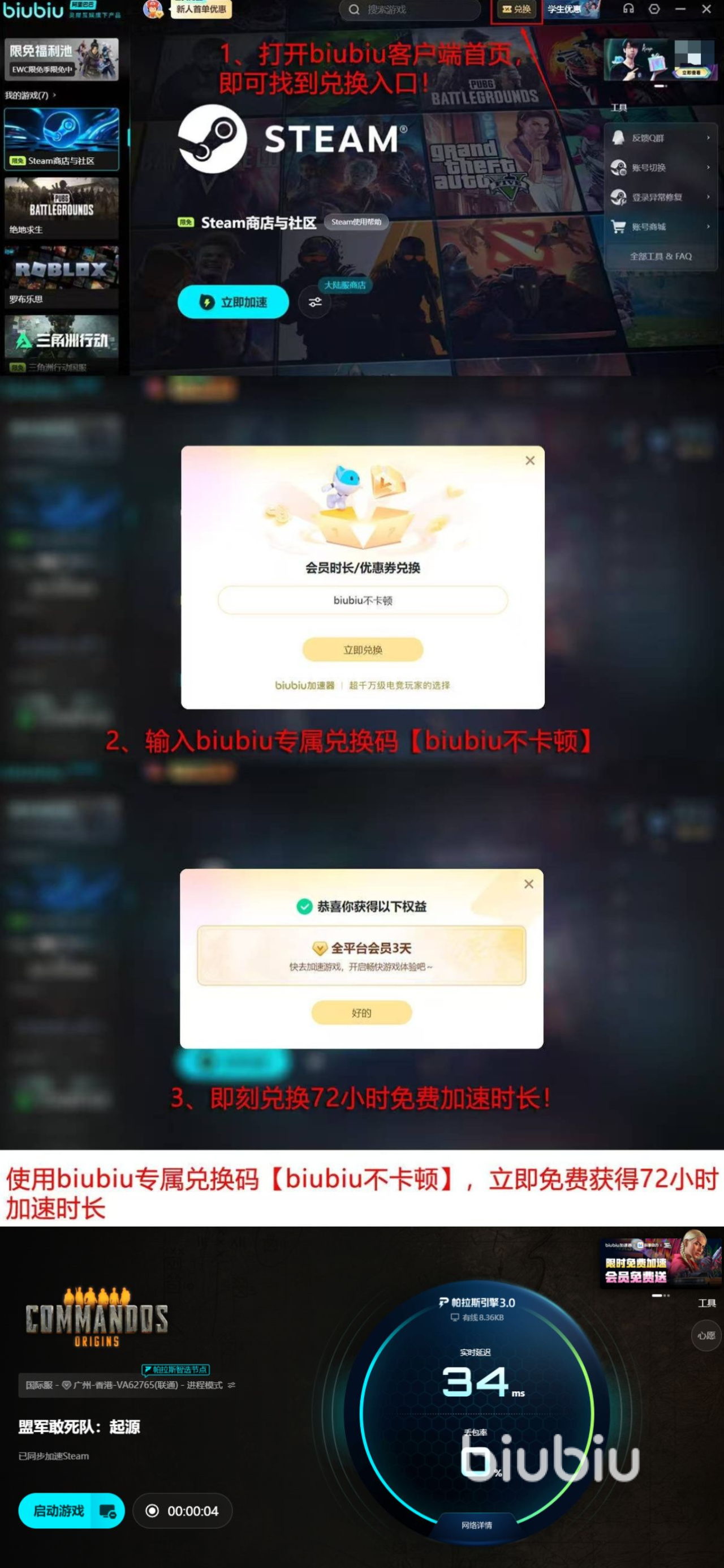 新用户注册后可即时获得24小时全功能试用权限,无需手动领取,系统自动激活至账户。如需延长测试周期,所有用户还可额外申领72小时加速时长,操作方式为在指定输入框内填写【biubiu不卡顿】即可完成兑换。