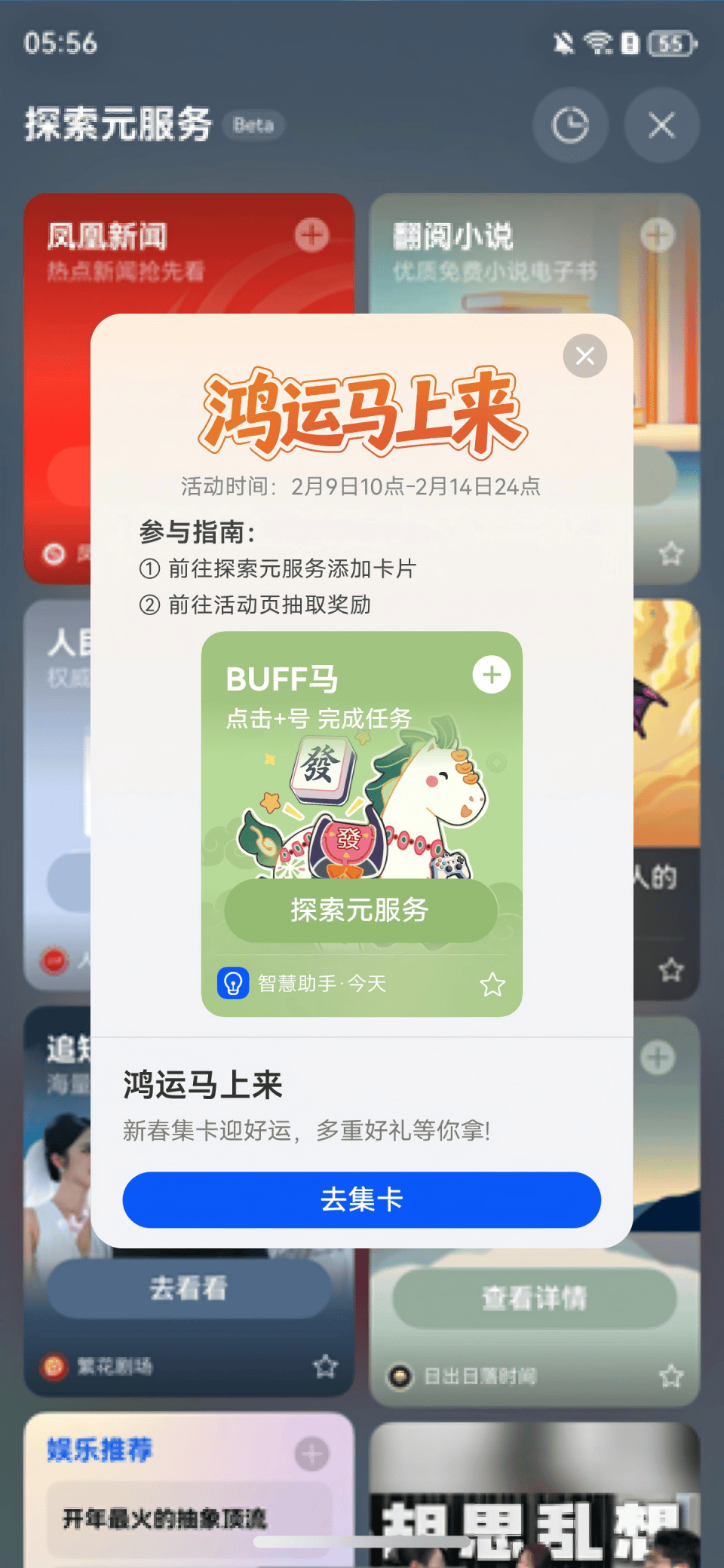 在2月9日到2月14日,手机桌面右滑至华为负一屏,搜索“鸿运马上来”即可参与活动,玩法超简单。活动期间会不定时放出6类活动卡片,只需在负一屏的探索元服务中找到春节活动卡片,完成操作任务,再点击卡片右上角“+”号,就能获得卡片。集齐6张活动卡片即可解锁新春终极大礼包,最高可获得2026元的优惠券呢!赶紧喊身边的亲人朋友一起来试试手气吧,让好运和福利在这个春节加倍!