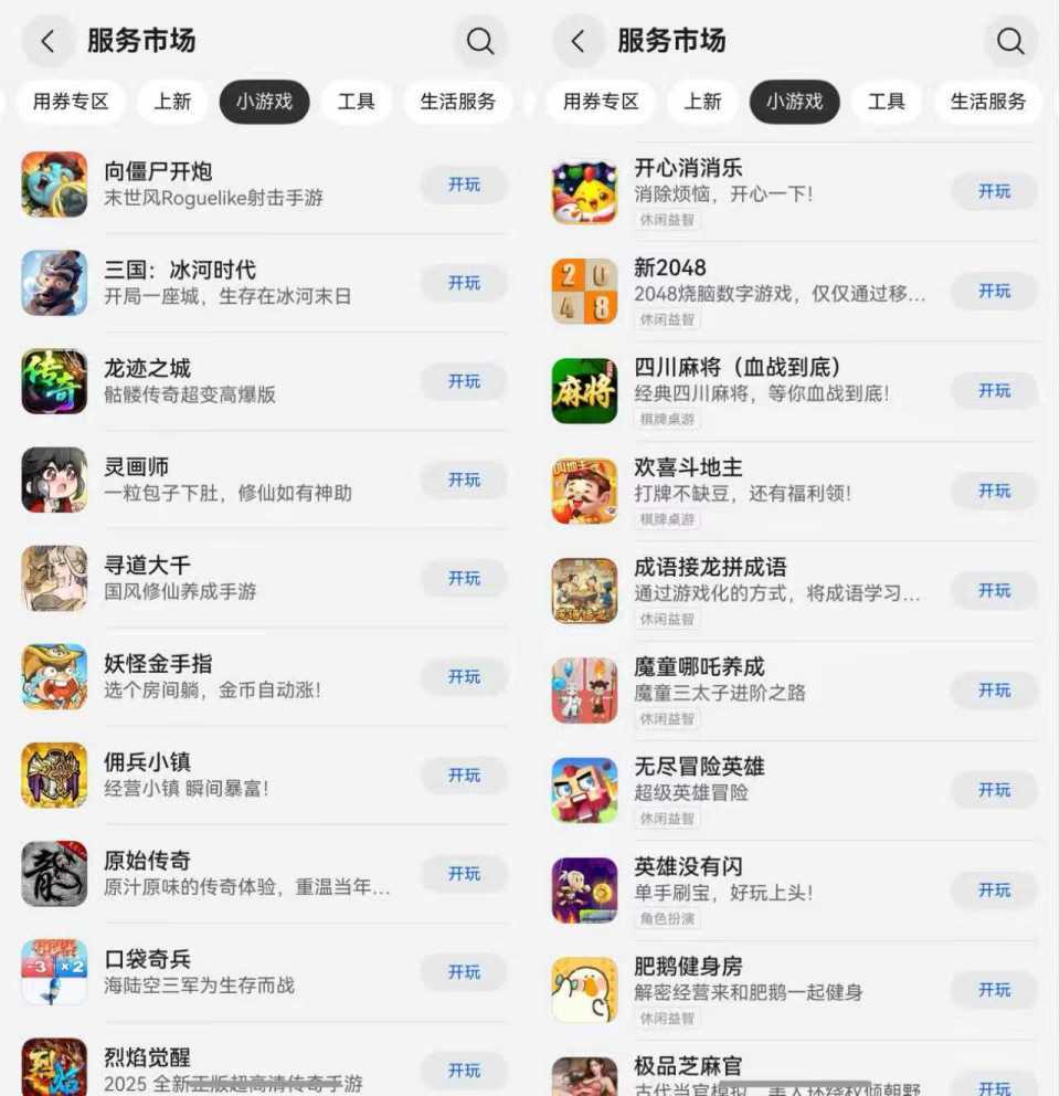 拜年间隙、茶余饭后,想活跃一下气氛,那就添加一个轻量的小游戏元服务。无论是斗地主、麻将、双扣等对战游戏,一键发起,全家一起“厮杀”;还是开心消消乐、2048等单机小游戏,点开即玩,轻松度过愉快时光。而且,这些游戏都无需下载App,真正实现了“即点即用,即用即走”。