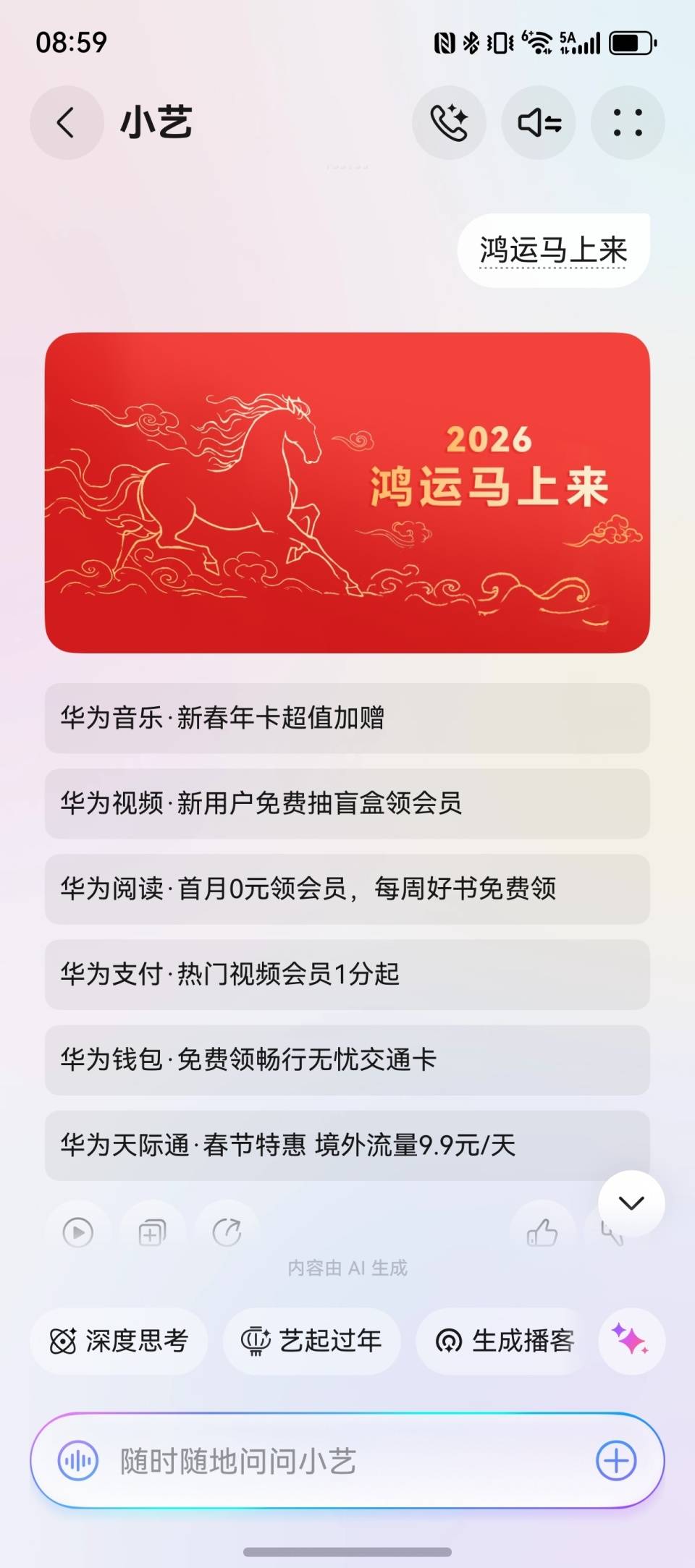 春节期间唤醒小艺后,跟它说“鸿运马上来”,还能享受到多重优惠,比如新春会员福利华为音乐的新春年卡超值加赠活动、华为视频的新用户免费抽盲盒领会员活动、华为阅读的首月0元领会员、华为支付的热门视频会员1分起等,非常划算。