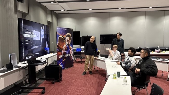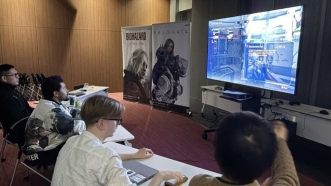 盆栽哥与《生化危机9》总监中西晃史、制作人熊泽雅人进行了深度交流,并体验了《生化危机9》《街头霸王6》《识质存在》。从照片中可以看到,盆栽哥身穿黑白花色夹克,专注PS5游戏画面。