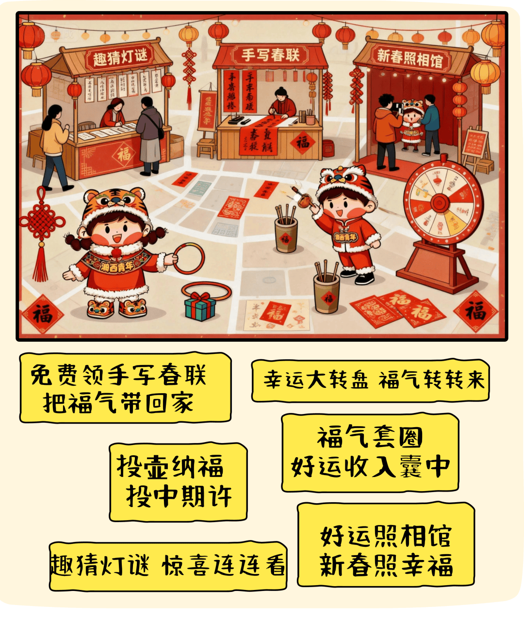 活动设有年味主题互动区,投壶纳福、福气套圈、趣猜灯谜、幸运大转盘、拍新春好运照等主题活动一应俱全,参与即有机会获得惊喜好礼(非遗文创、集市摊位消费优惠券、景区门票、生活小家电等),团团还特别邀请到湘西州老年书画家协会成员现场写春联送祝福,让你把青春福气直接带回家!