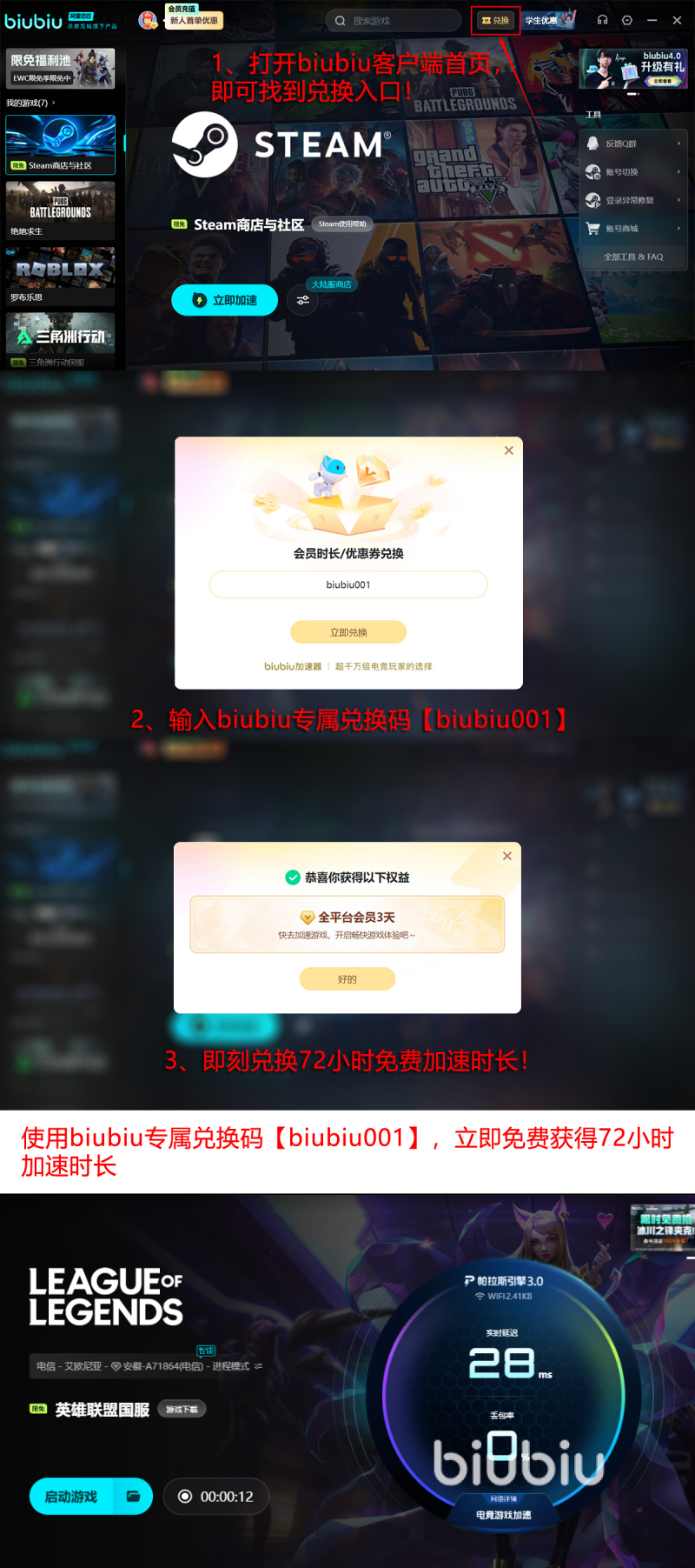 这款加速应用所具备的实力也是非常强大的,不仅是阿里巴巴灵犀互娱所打造,除此之外自研的帕拉斯3.0引擎,也能够让大家享受所带来的流畅网络。就连在绝地求生比赛当中获得冠军的选手小叮当,早就给大家极力推荐,所以它不仅是很多普通人可以使用的,就连一些专业的电竞选手,甚至是团队都可以使用。如今的免费送加速时长的福利,对于新老用户来说都是非常好的,因为新老用户只需输入口令【biubiu001】就能享受免费加速三天的时长。如果是初次注册的,还可以额外的通过注册以后解锁24小时,相当于一共能够加速96小时。