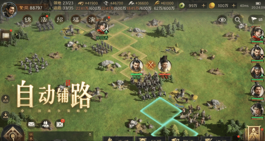游戏里有很多自动化操作,比如自动铺路、打城和政务委任。自动功能完全可以帮大家省去这些重复性的劳作。游戏的抽卡性价比很高,而且公开了高橙将概率与保底机制。同时养成也很友好,不锁核心武将和战法,解锁消耗的还是铜币。